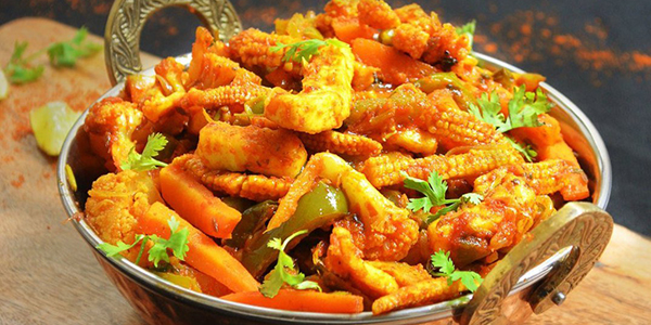 Chicken, lamb, chicken tikka, tiger prawns in garlic, onions, bell peppers, tomatoes and special karai masala